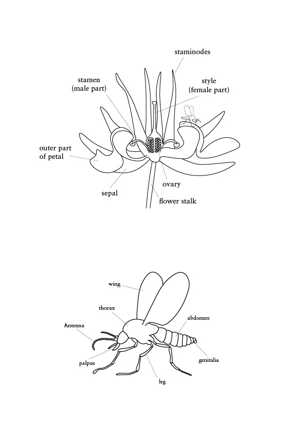 schematic drawing of the cacao flower and the Forcipomyia genus